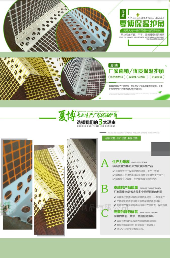 夏博公司業(yè)務(wù)員經(jīng)常有客戶打電話來詢問護(hù)角網(wǎng)上的網(wǎng)格布能不能粘在pvc護(hù)角網(wǎng)的內(nèi)側(cè),從生產(chǎn)工藝上來說是完全可以的,但是從施工方面來說是不行的,大家想一下,如果網(wǎng)格布在產(chǎn)品的外側(cè),受到外界撞擊時(shí)護(hù)角條先受到,時(shí)間一長(zhǎng)保溫層就會(huì),網(wǎng)格布時(shí)間長(zhǎng)了也會(huì)受到撞擊而受損。但是如果網(wǎng)格布在外側(cè),外面的網(wǎng)格布受到,里面的護(hù)角條還會(huì)保護(hù)墻角。